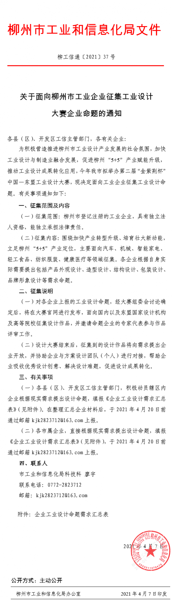 關(guān)于面向柳州市工業(yè)企業(yè)征集工業(yè)設(shè)計(jì)大賽企業(yè)命題的通知(2021-04-07)